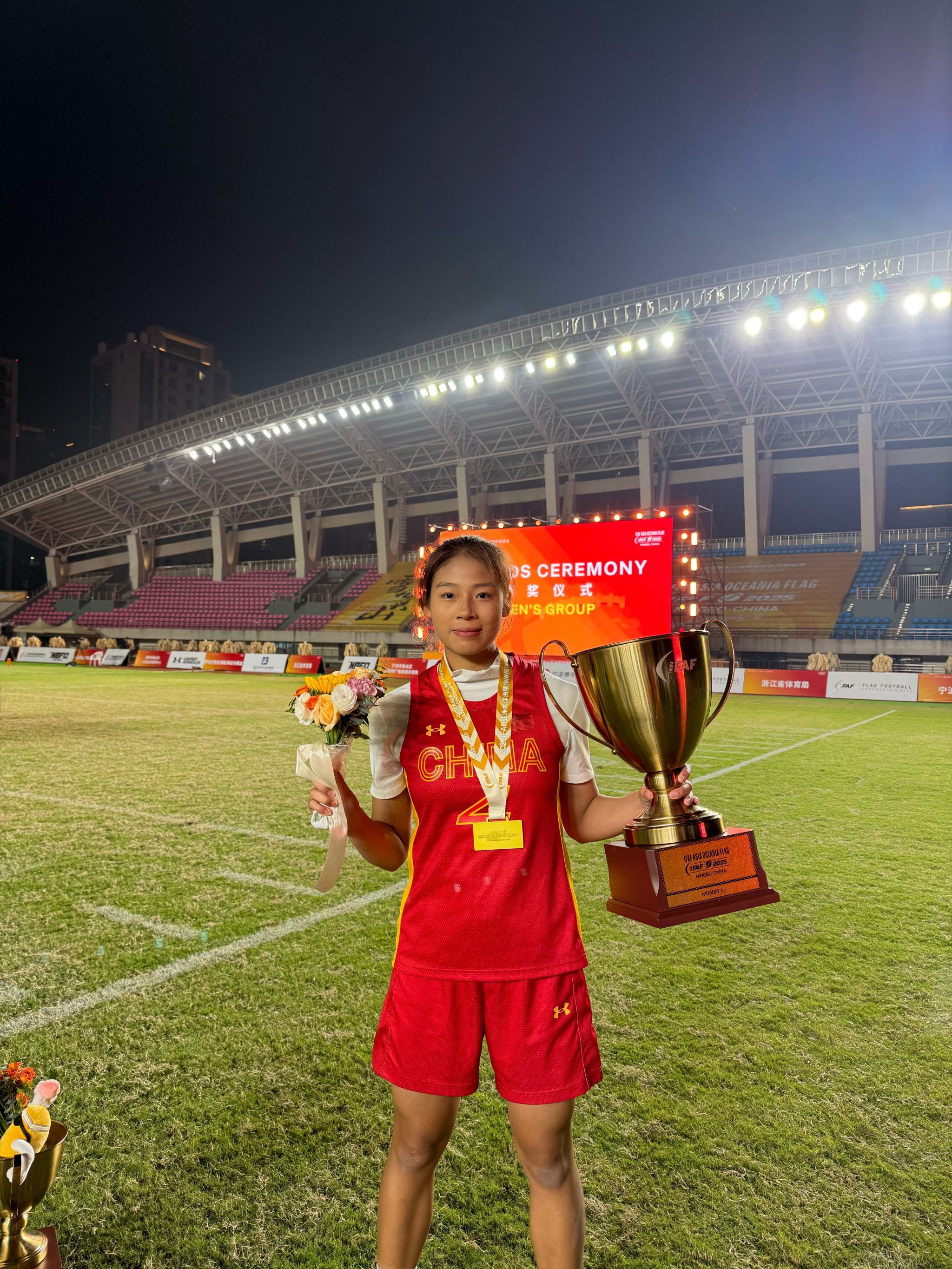 近日,2025IFAF亚洲大洋洲腰旗橄榄球锦标赛在宁波奉化体育中心圆满落幕。公司2024级运动训练专业员工曾思盈作为国家队一员,随中国女子腰旗橄榄球队奋勇出战,助力队伍接连斩获亚洲分区冠军及洲际总冠军,并成功夺得2026年德国杜塞尔多夫世锦赛参赛资格!
