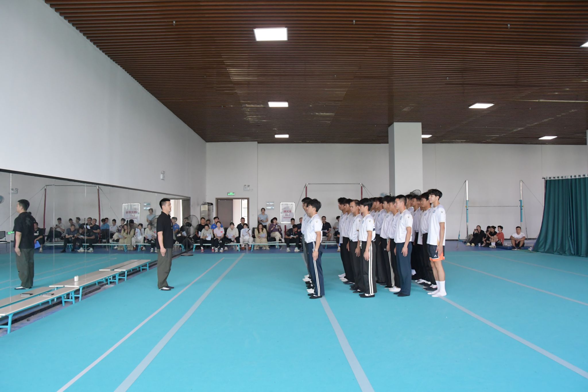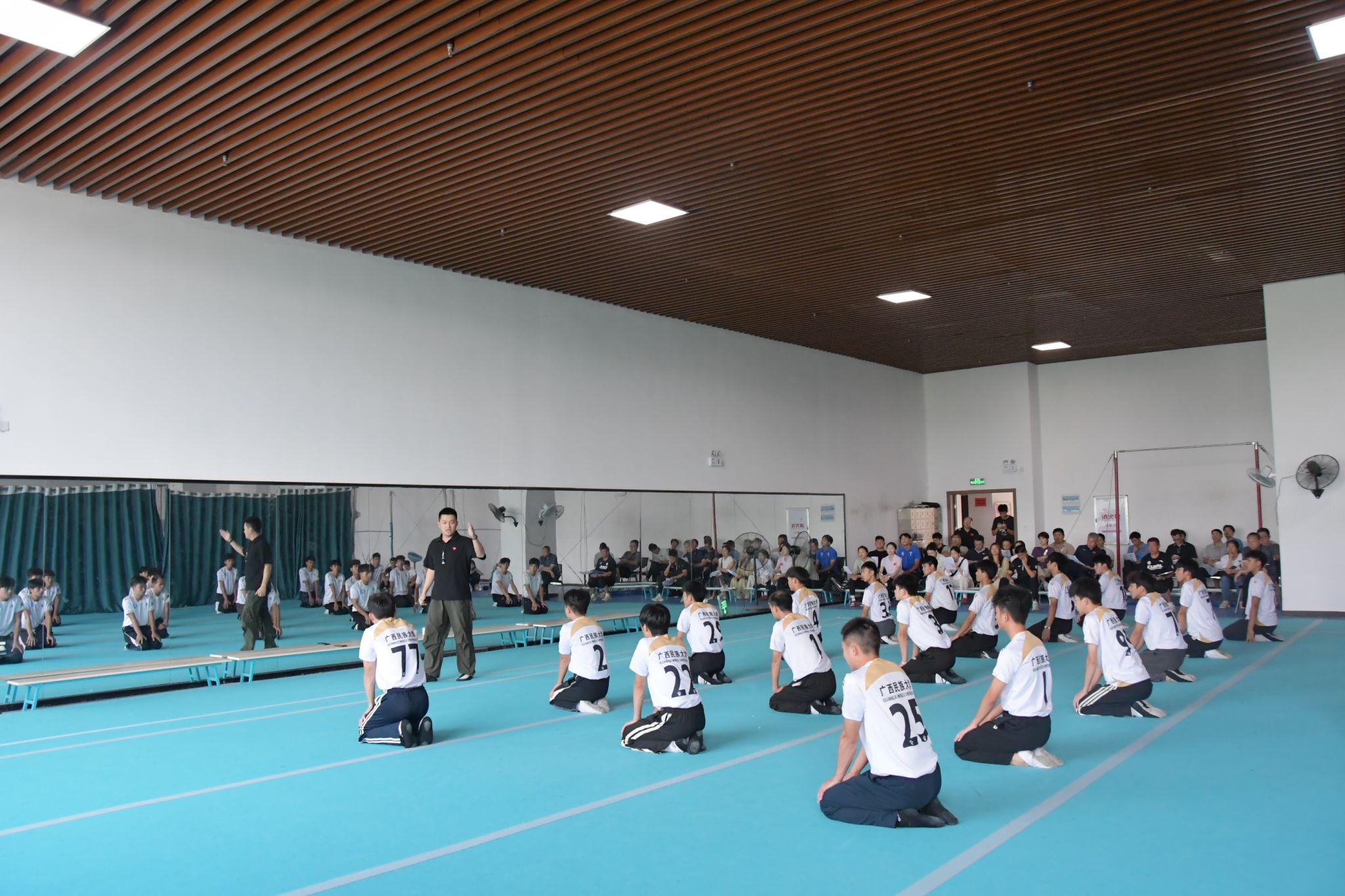 在体操教学现场,王勇老师以体操倒立类动作为教学核心内容,巧妙运用“学、练、演、评”一体化教学模式,构建起系统且高效的教学链条,整个教学过程环环相扣、层层递进,让员工在安全且充满挑战的氛围中逐步掌握技术要领。